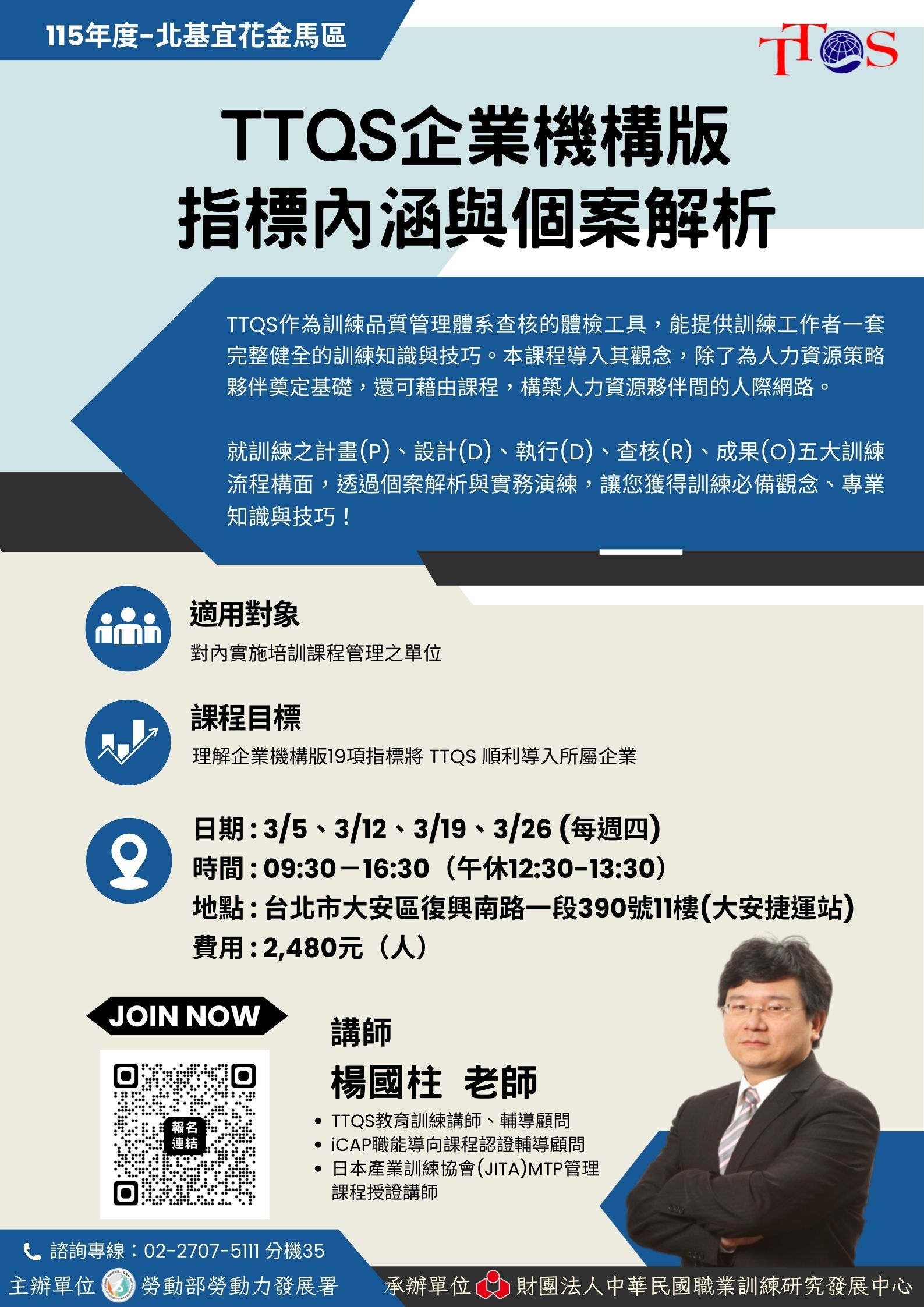 課程名稱 〔已額滿〕TTQS企業機構版指標內涵與個案解析(115/3/5開課-楊國柱老師)